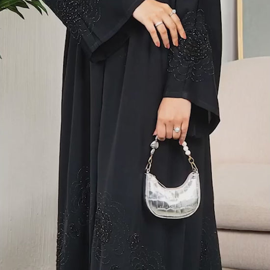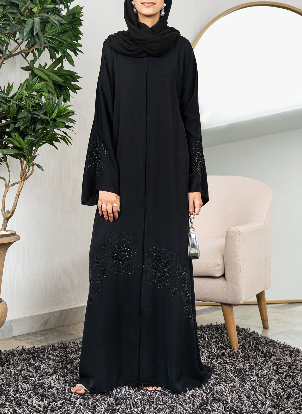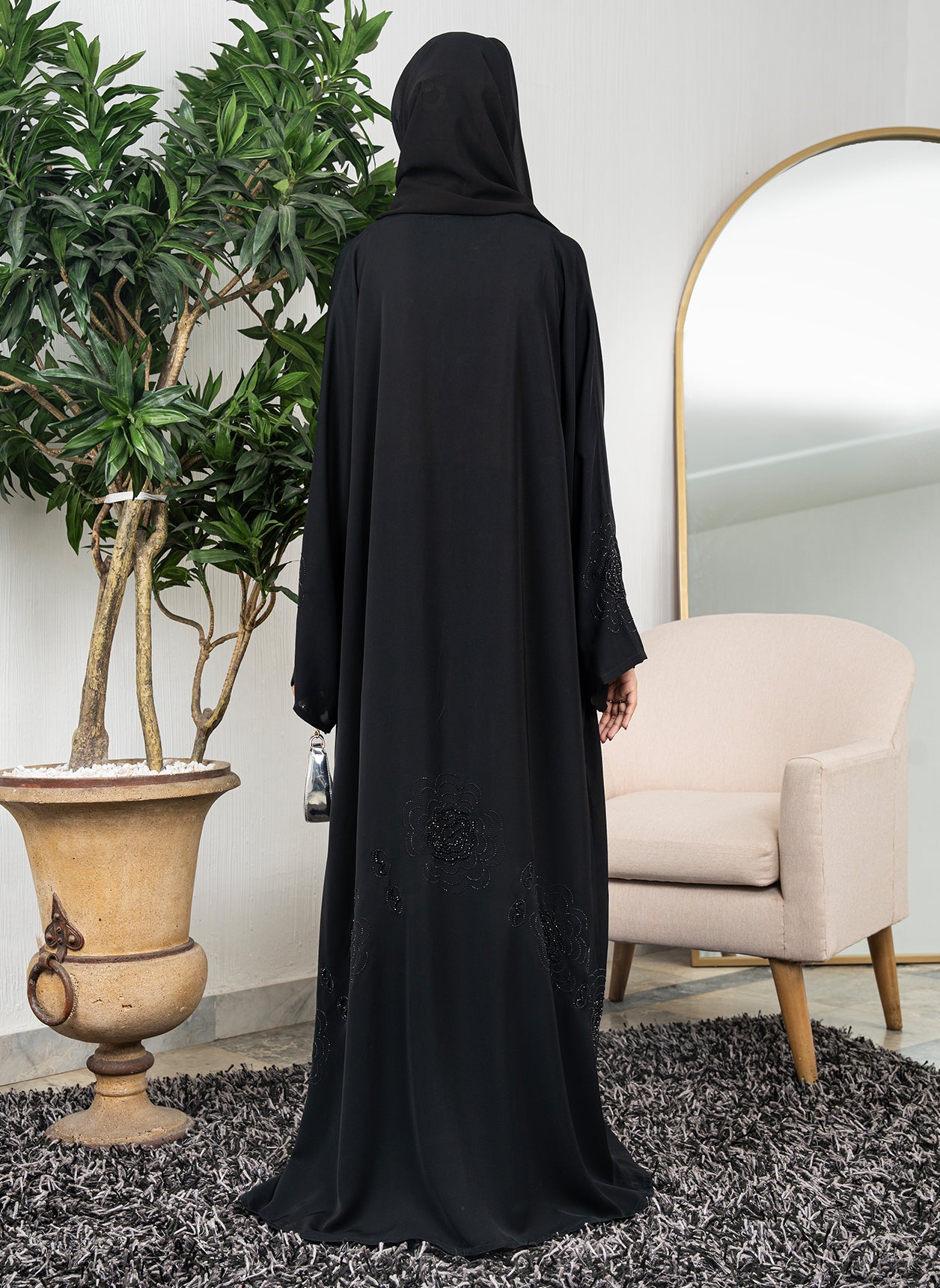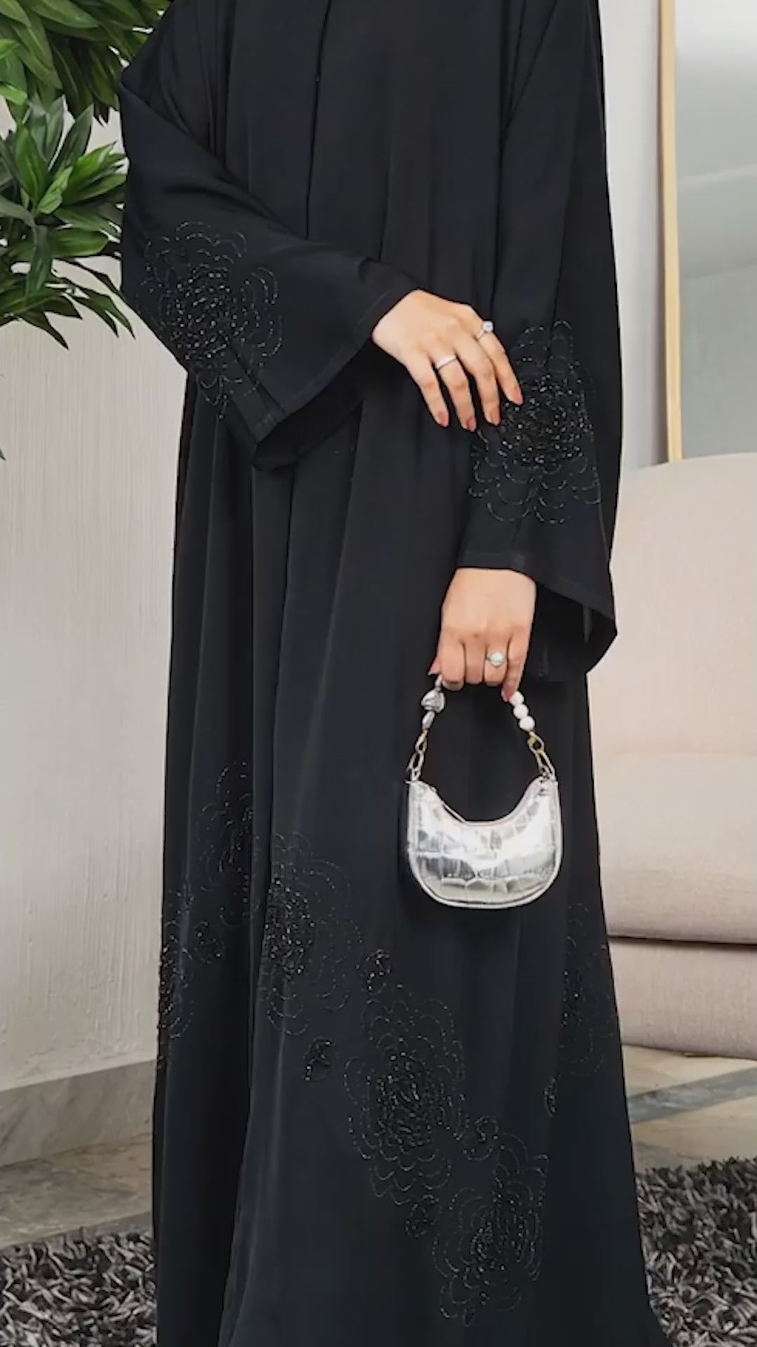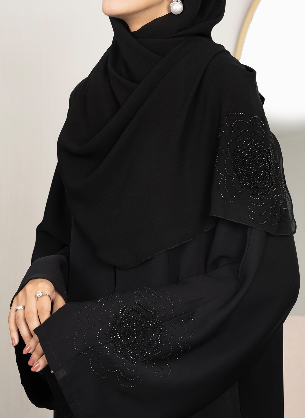 The Black Rose abaya is a true statement of craftsmanship. Featuring intricate black Cutdana handwork shaped into roses, the luxurious Nada fabric enhances its opulence. Comes complete with a matching scarf.