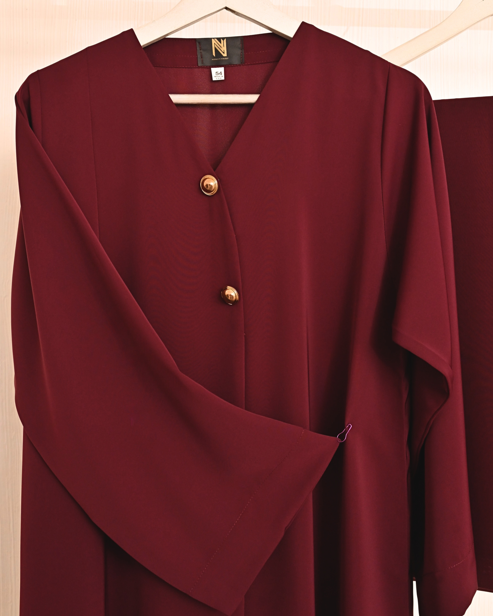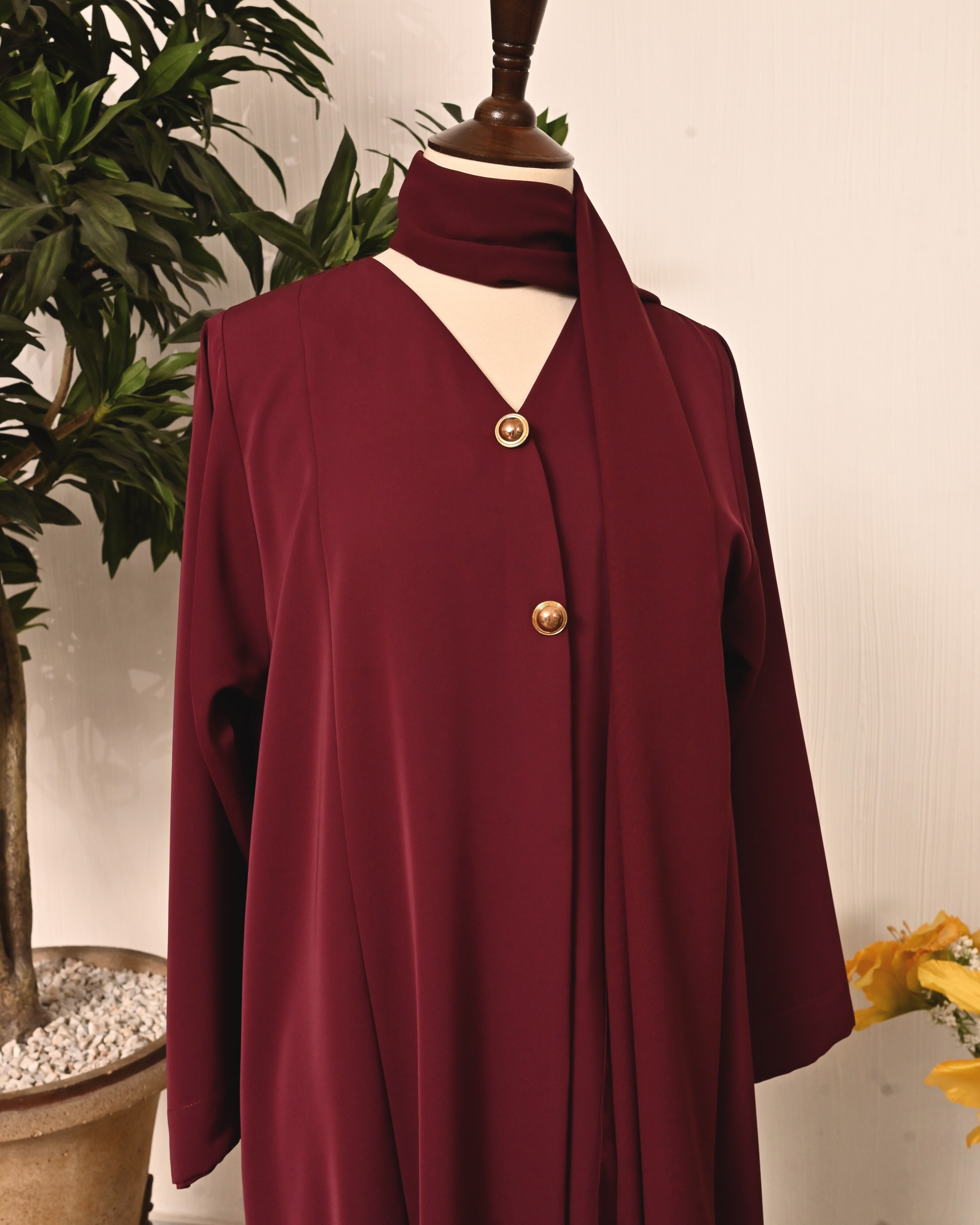Burgundy Abaya Crafted in a graceful, flowy silhouette with statement wide sleeves and delicate gold button detailing, this abaya speaks of effortless sophistication. Paired with a matching scarf for a complete refined look — perfect for formal gatherings, dinners, or elevated everyday wear.