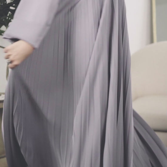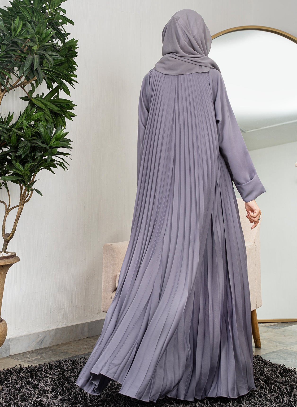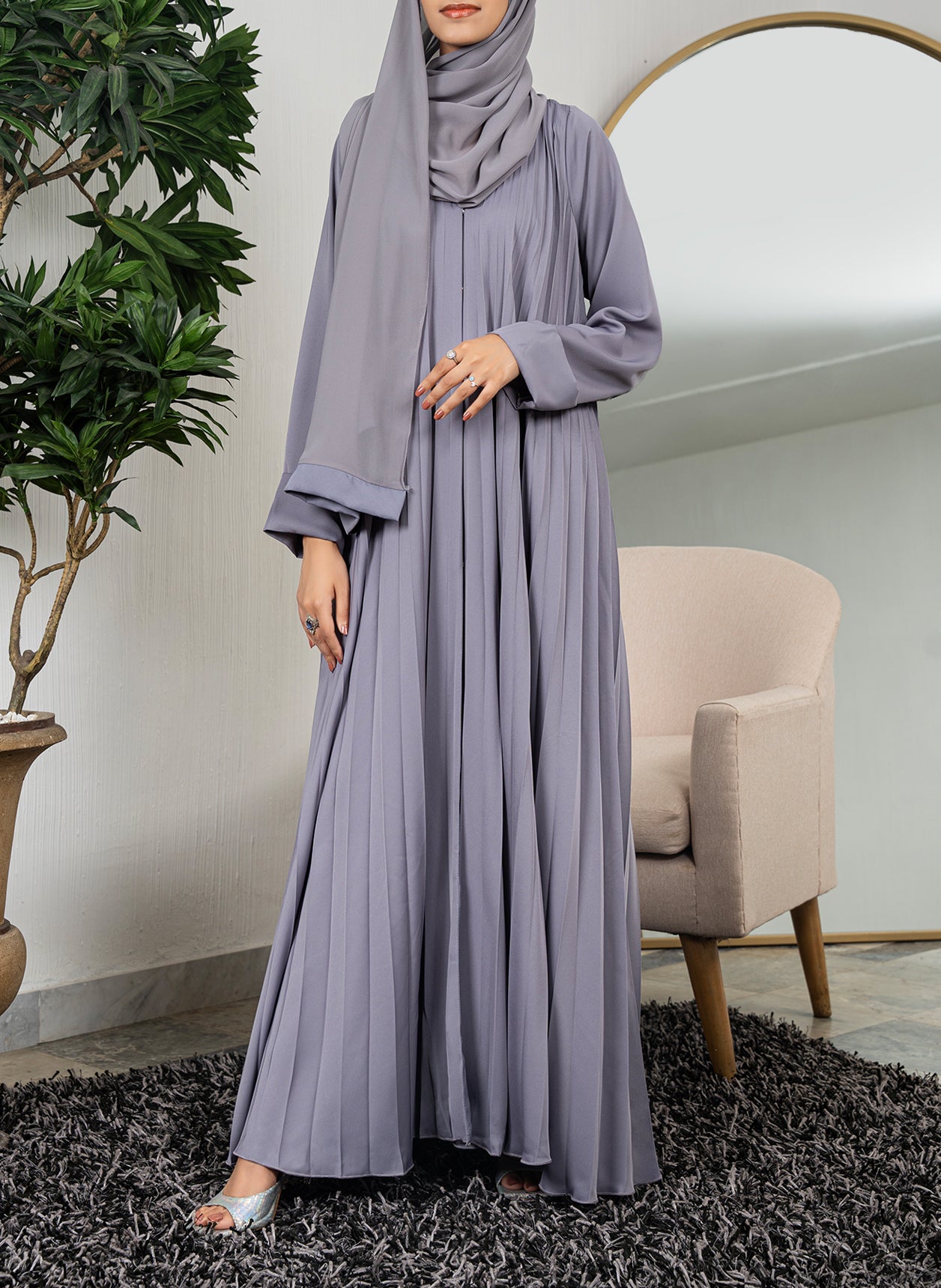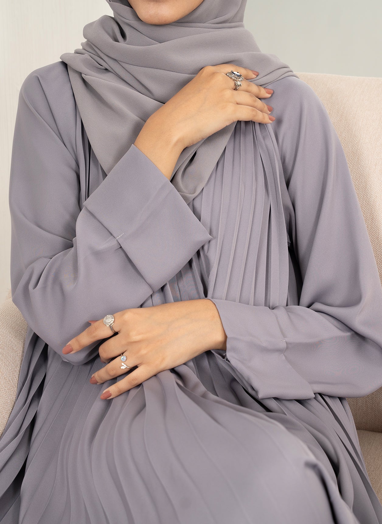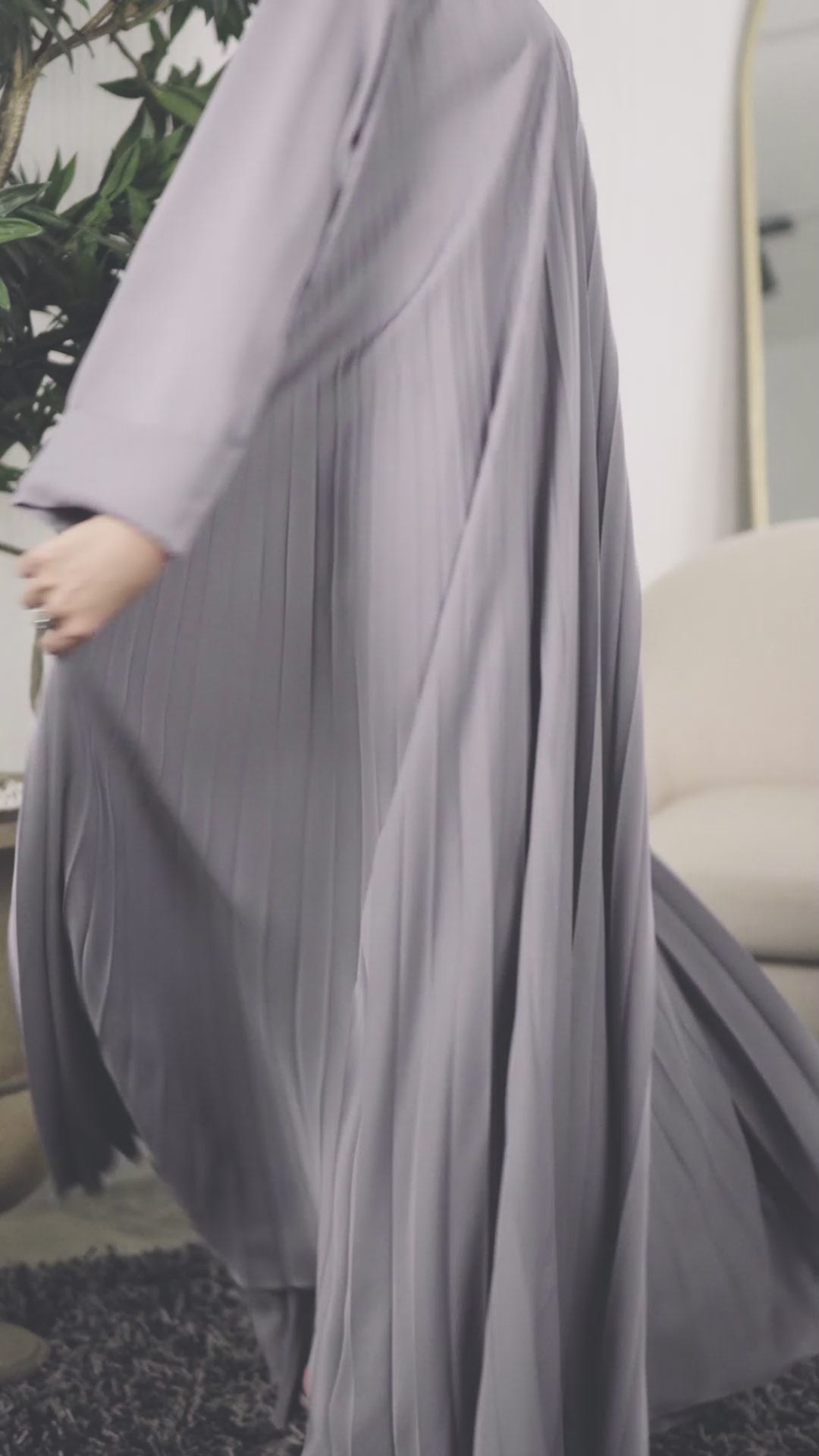 A dreamy abaya crafted from luxurious crushed Nada fabric, designed with delicate pleated work for movement and grace. Paired with a soft matching shehla, it’s an effortless blend of elegance and comfort.