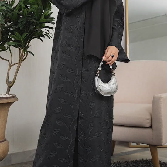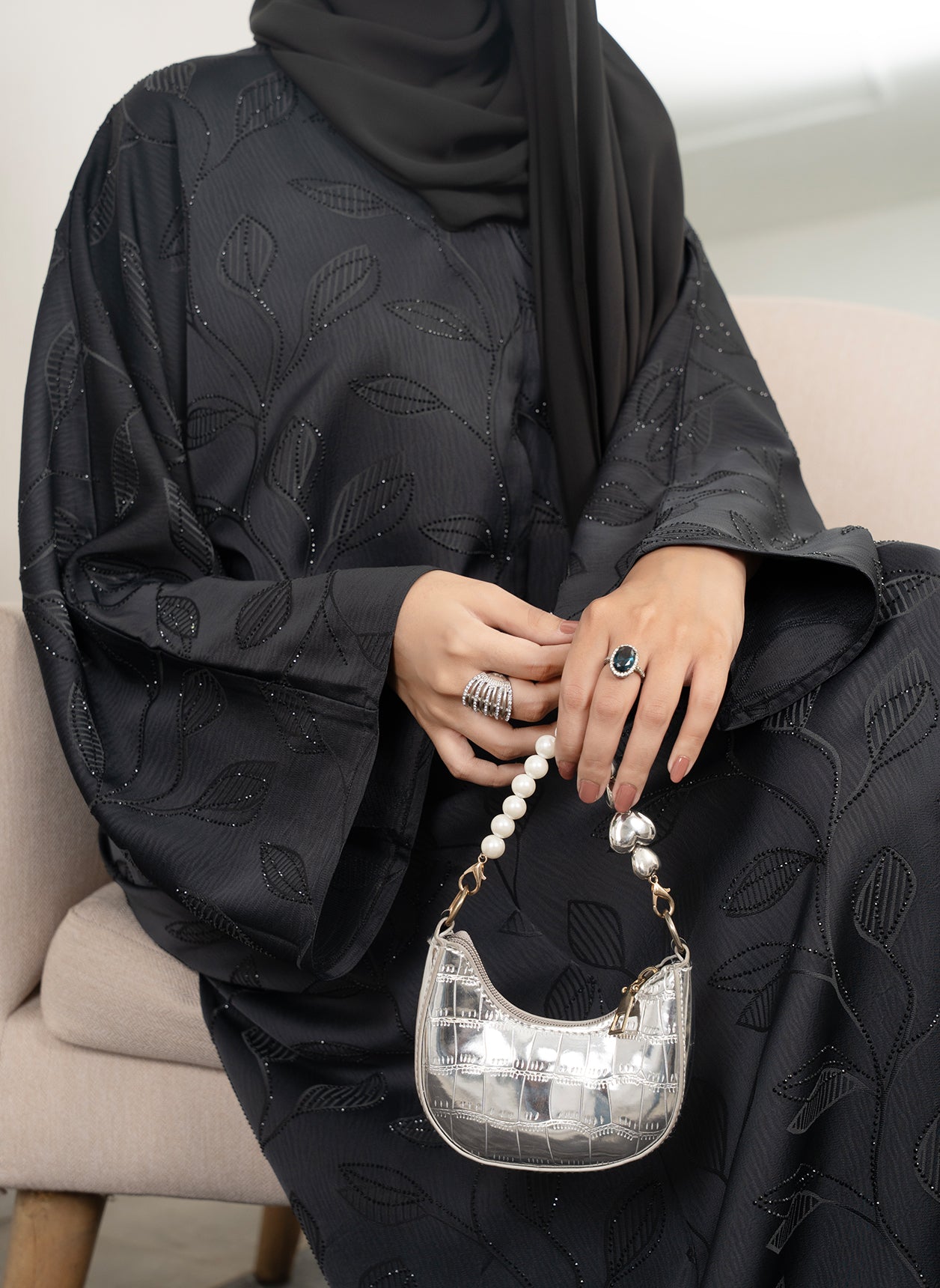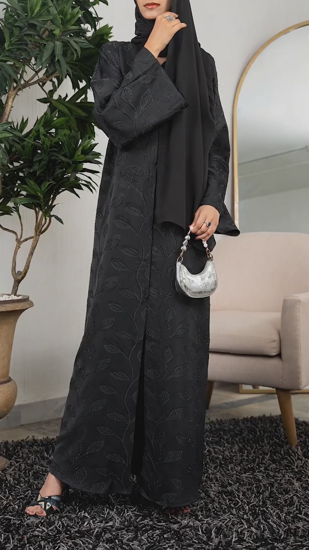Grace Ash is a masterpiece of luxury silk satin, shimmering with all-over sequins that exude sophistication. Available in Ash with a graceful drape, this abaya is your statement of refined elegance.