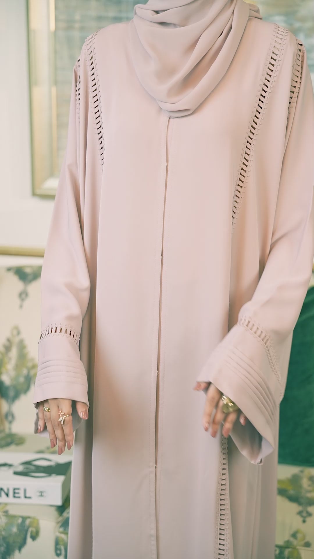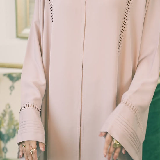 The Haya Beige abaya embodies sophistication with its lace detailing on both the front and back. Designed in premium fabric and finished with a graceful silhouette, it radiates timeless elegance.