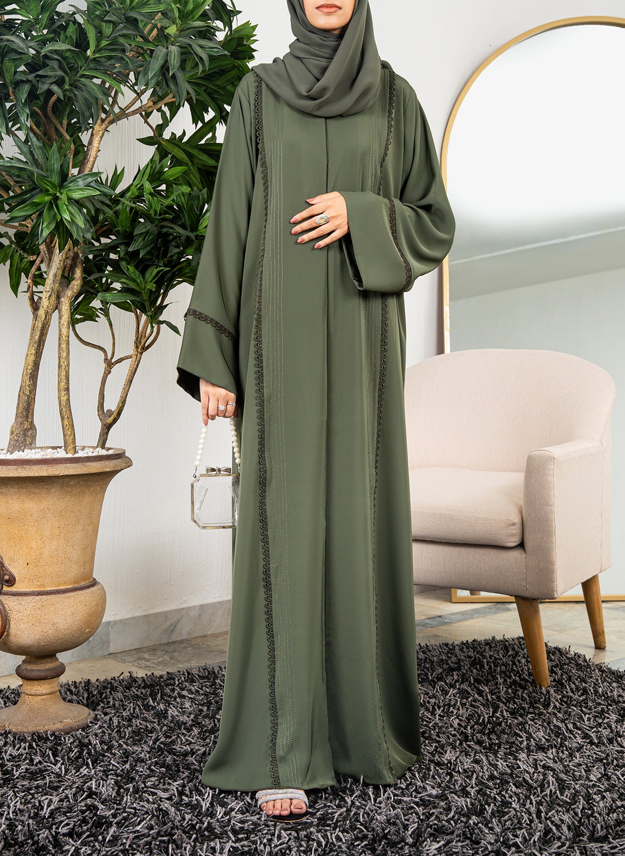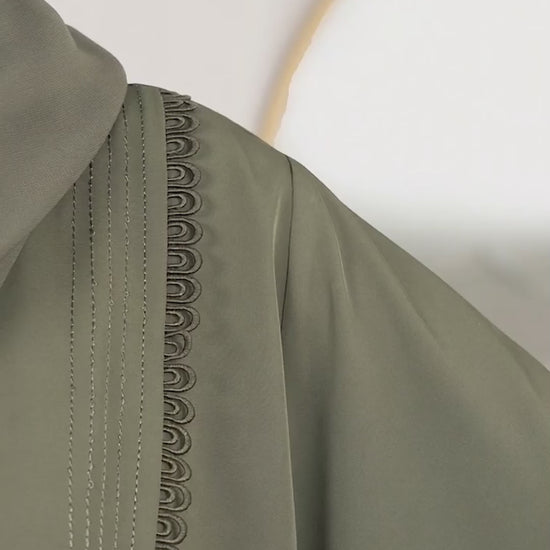 Designed to complement your morning and evening gatherings, this Olive Green abaya is beautifully adorned with delicate lace work. Crafted in premium Nada fabric and paired with a fine matching shehla, it’s elegance in every detail.