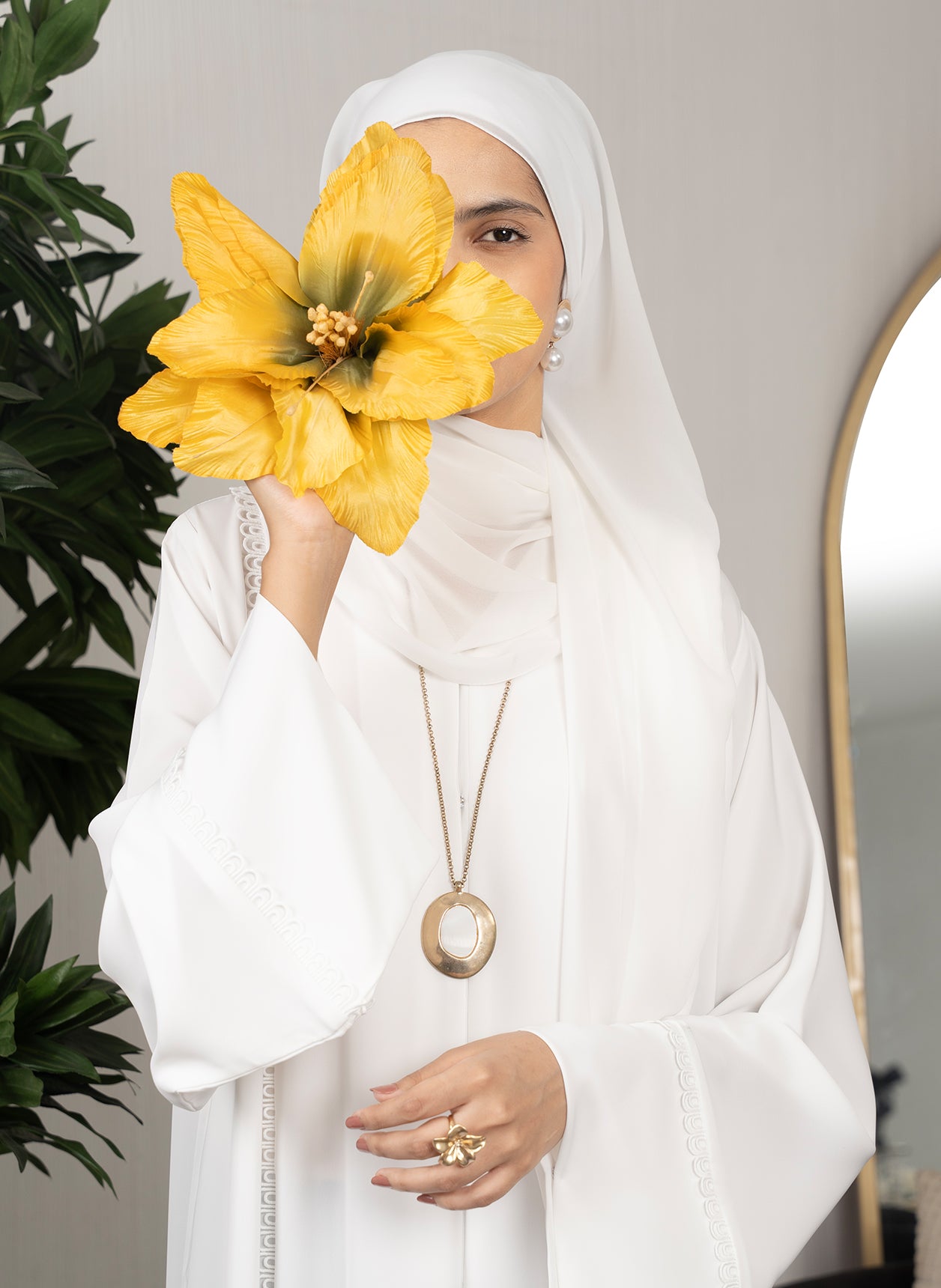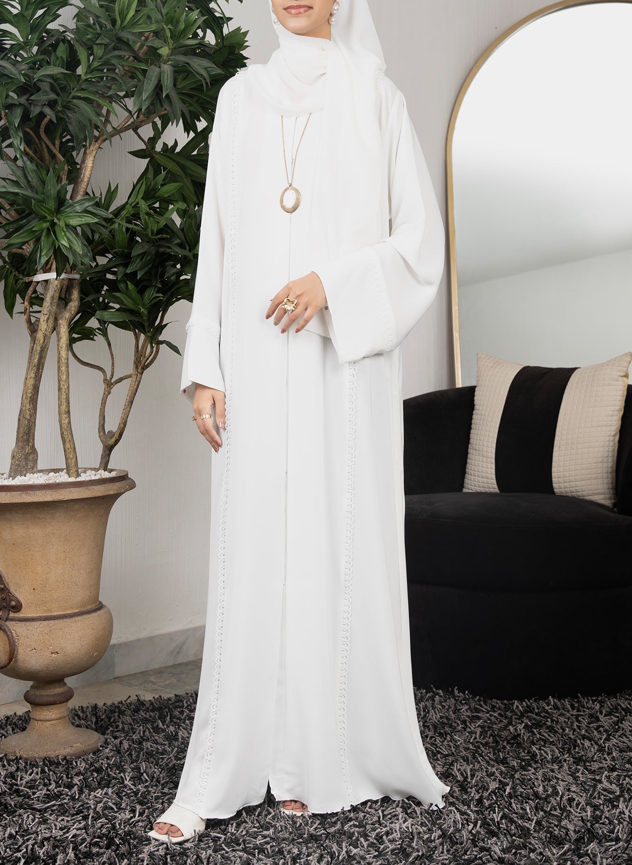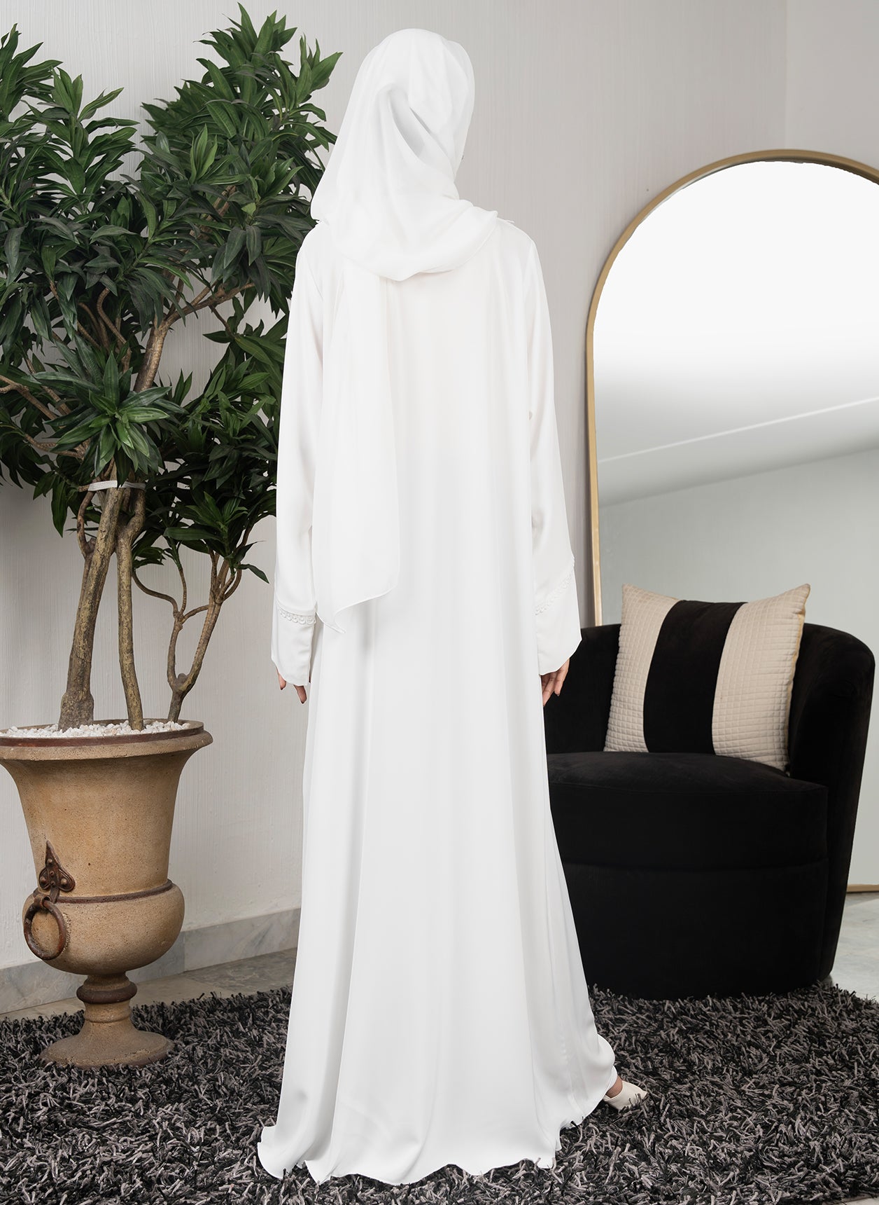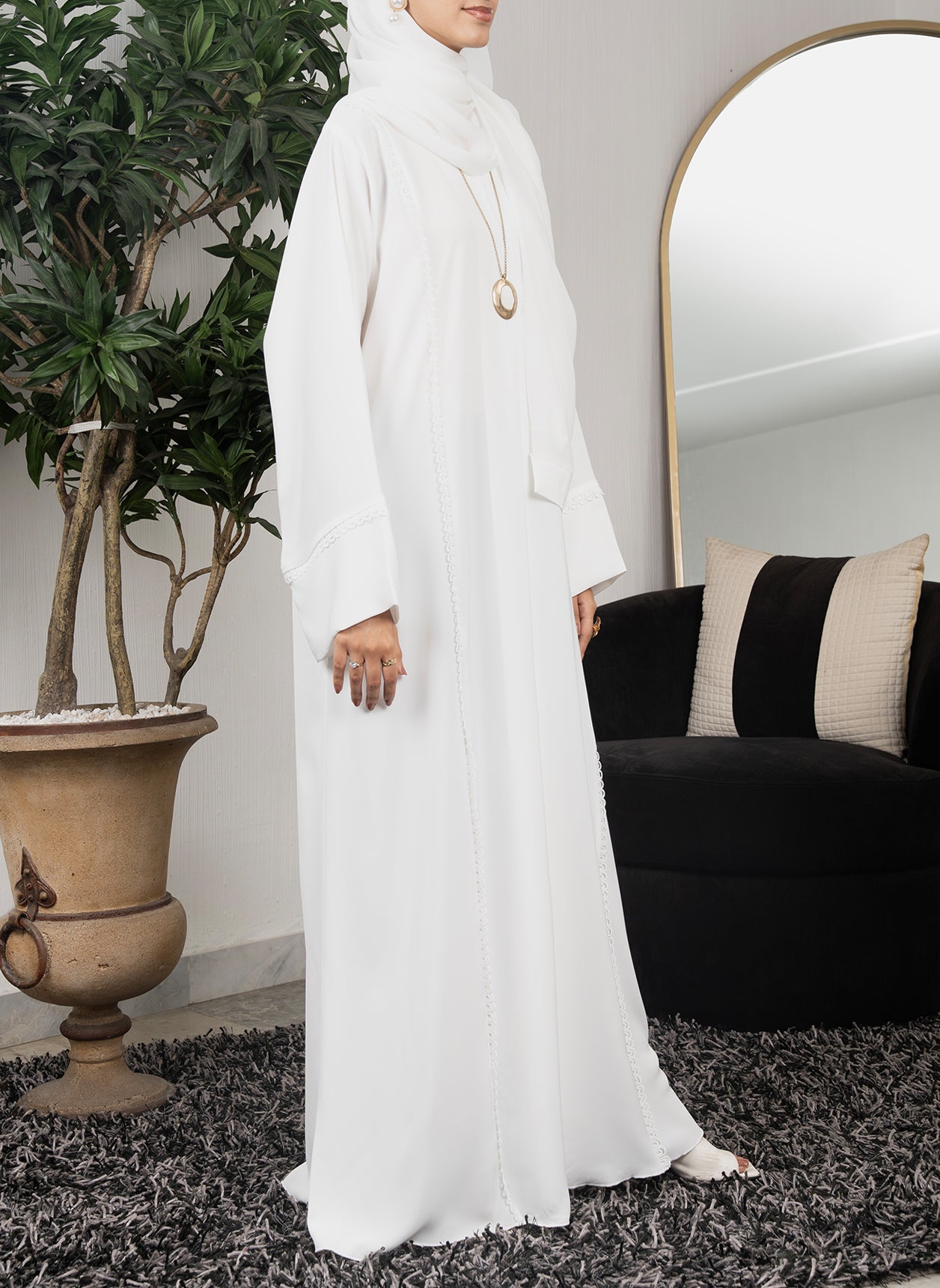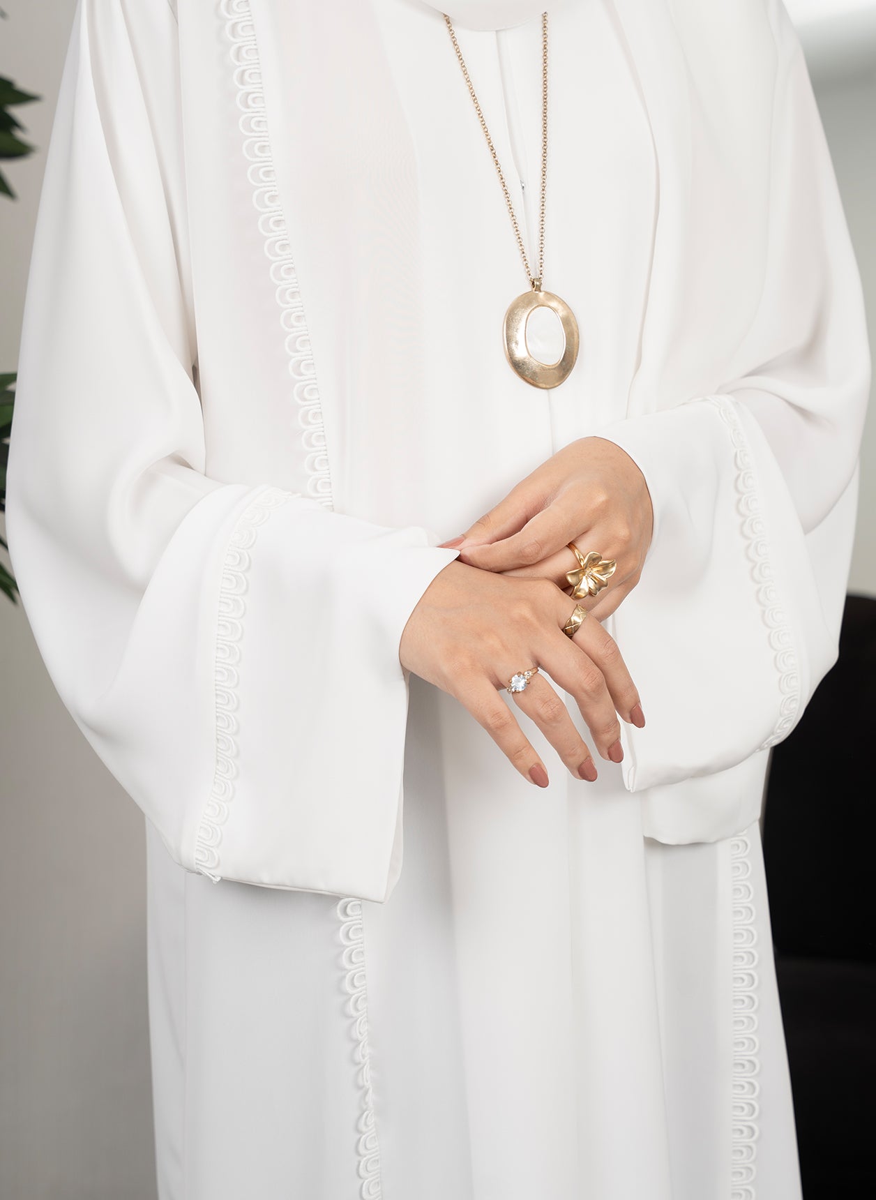 An exquisite white abaya crafted from the finest Nada fabric, featuring elegant lace on the front and sleeves. Designed for your Umrah and Hajj journey, it balances tradition, comfort, and sophistication.